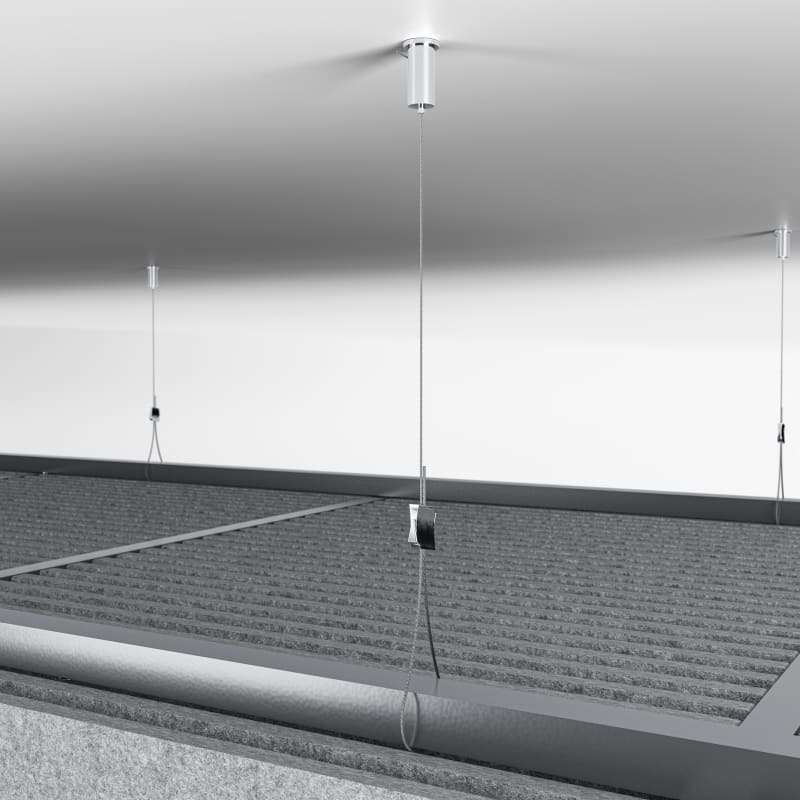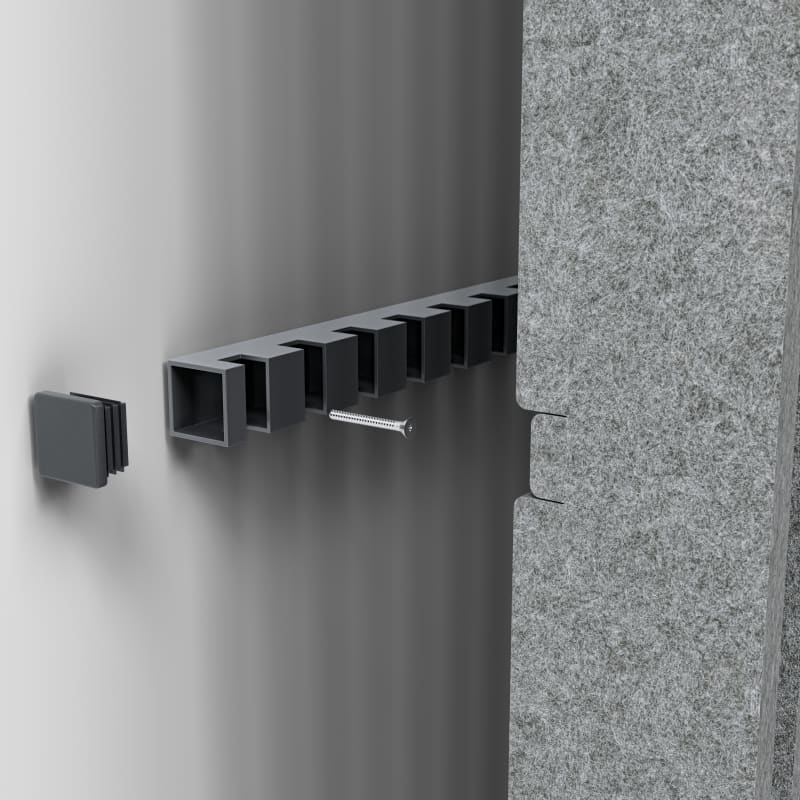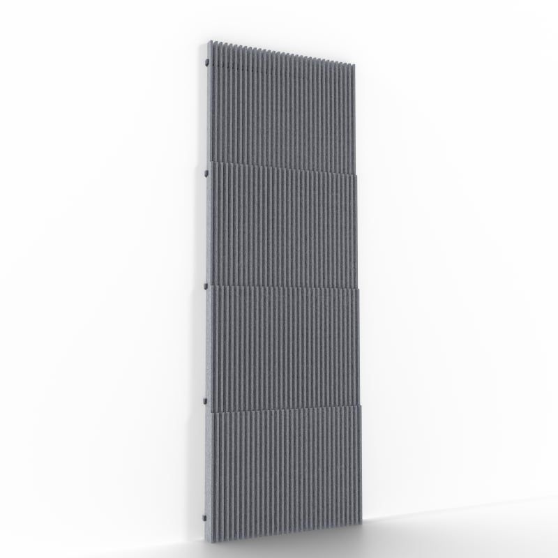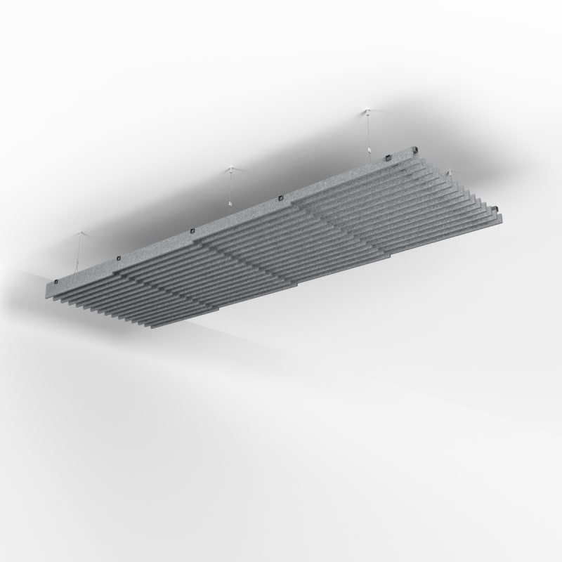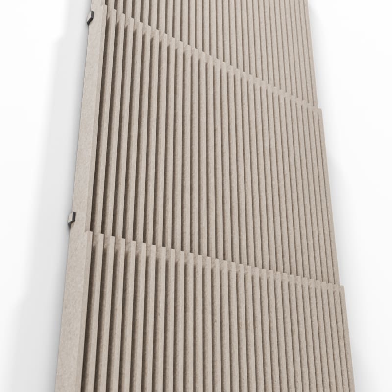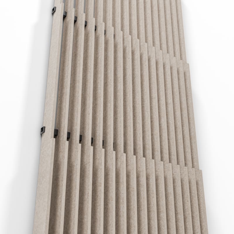 Stacked Baffle System comprises 32 prefabricated baffles in a stepped profile of varying heights. Each baffle press-fits into precision-notched cross supports. Perfect for suspension, wall mounting, or integrated transitions.