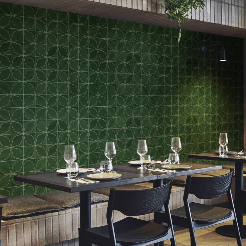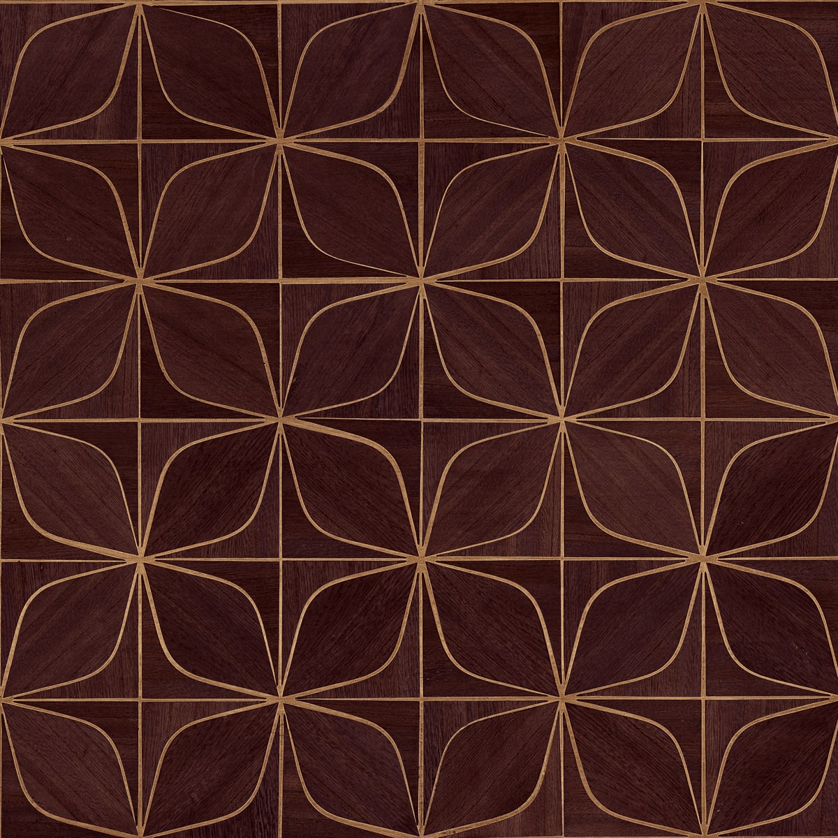Organic wallcovering with clove-like curves and rhythmic, floral-inspired geometry.