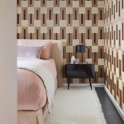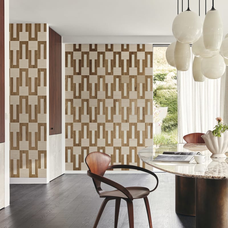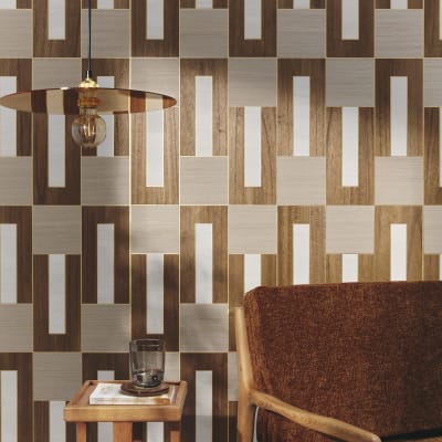 A delicate puzzle of hand-laid wood pieces on a metallic background, inpired by the 70ies. Available in 3 colourways.