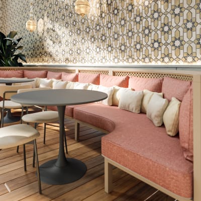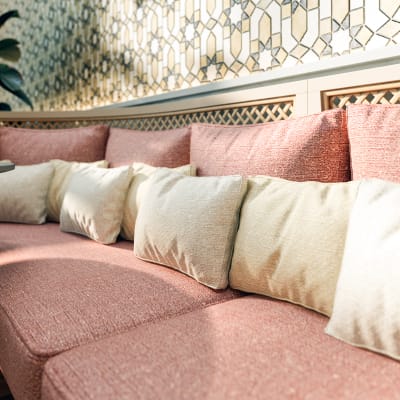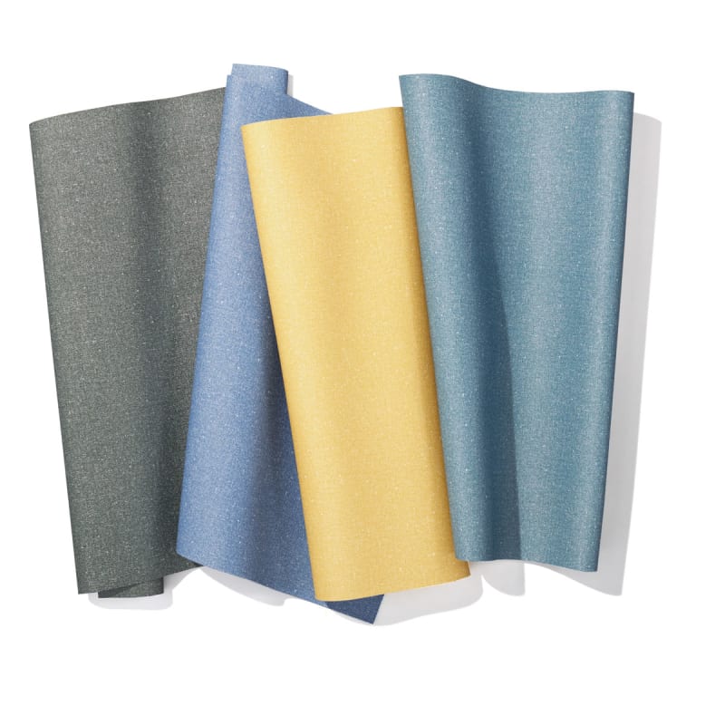 Ether, a phthalate-free vinyl with a glazed linen look, is strong, smooth, and Graffiti-Free®, offering durability, aesthetic appeal, and bleach-cleanable surfaces.