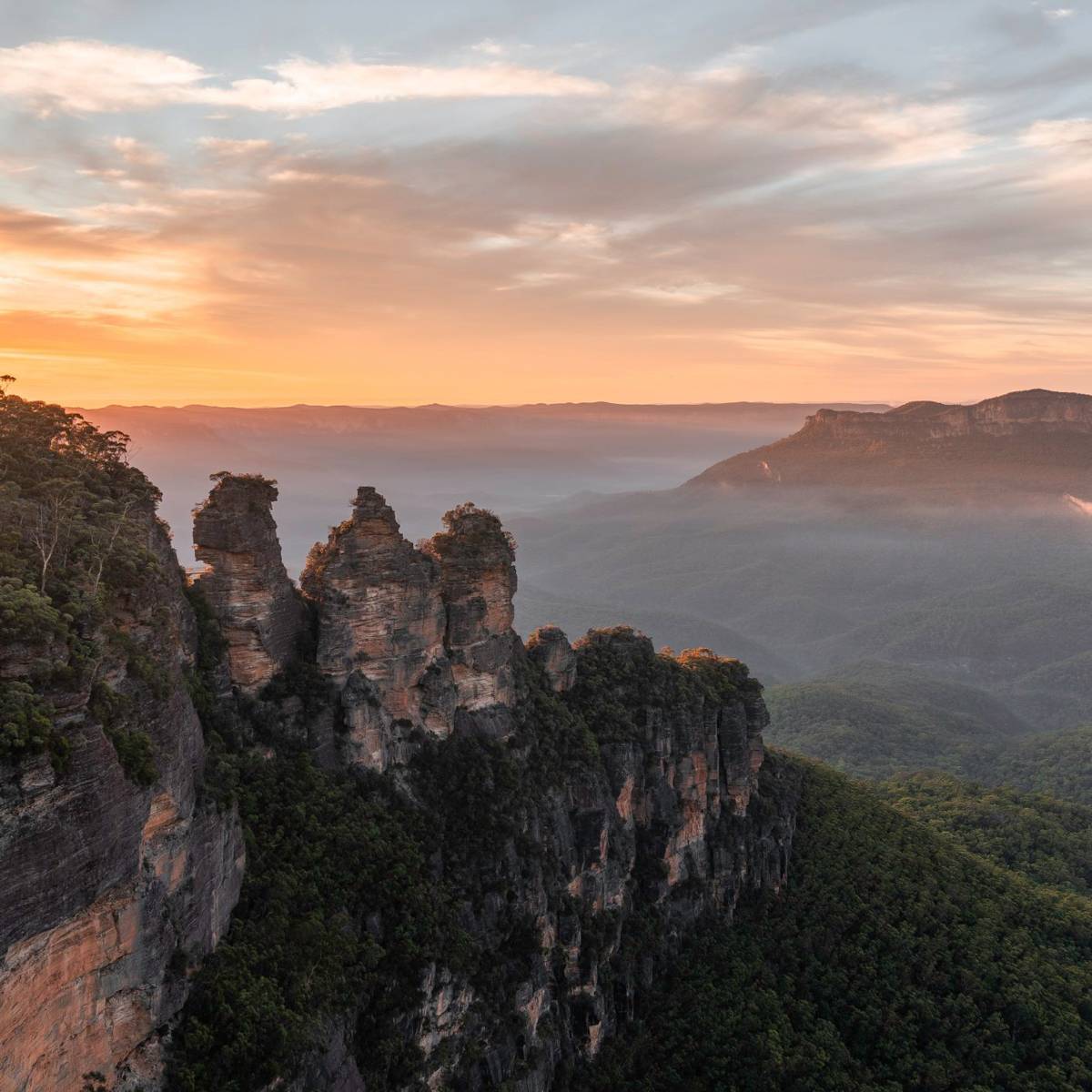 Golden Hour Cliffs captures the sunrise mist at the Three Sisters from Echo Point. Seraphic Digital Print is customizable in any surface